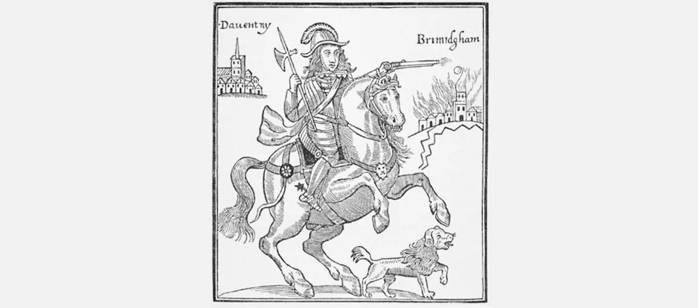 Frontispiece of the Parliamentarian pamphlet ‘A true relation of Prince Rupert's barbarous cruelty against the towne of Brumingham’, showing Prince Rupert attacking ‘Brumingham’ during the Battle of Birmingham in 1643.