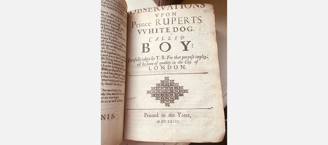 This Parliamentarian superstition towards Boy, and their obsessive demonising of the little white poodle, caught the attention of Royalist satirists, who mocked and ridiculed such attitudes in their own parodies and pamphlets. One satirist’s publication claimed that Boy was a shapeshifting ‘white woman’, some ‘Lapland Lady’, ‘who by nature was once a handsome white woman, who by some art is become an handsome white Dogge’. It is here in the Chatsworth archives that we have come across such a story. Bound in a leather volume, amongst 52 other pamphlets, is a copy of the ‘Observations upon Prince Rupert’s White Dog Called Boy’, a satirist piece published in 1643.