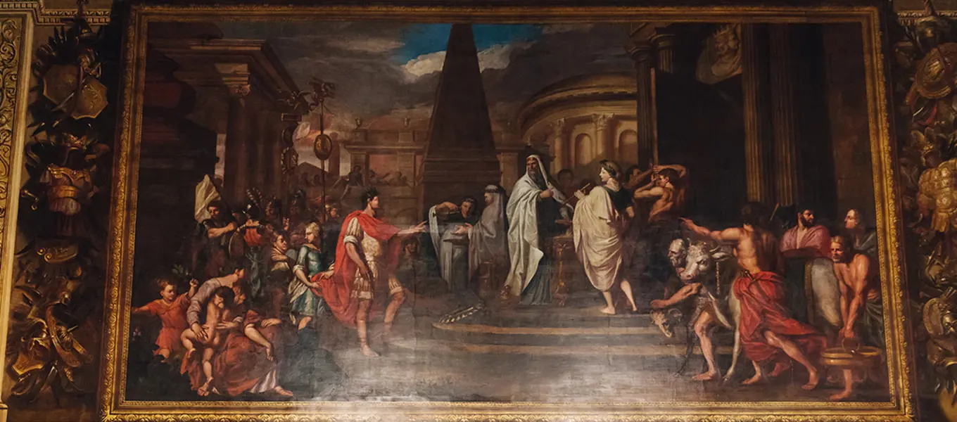 Dominating the room is the painted decoration which gives rise to its name, the only part of the interior which survives from its creation in 1687-1694. The paintings were painted by Louis Laguerre (1663-1721) and depict scenes from the life of the Roman General Julius Caesar (100-44 BC). The long east wall, pictured below, shows him offering sacrifice at the Temple, flanked by oval scenes, painted in imitation of carved stone, which illustrate his journeys across the Rubicon River and the English Channel.