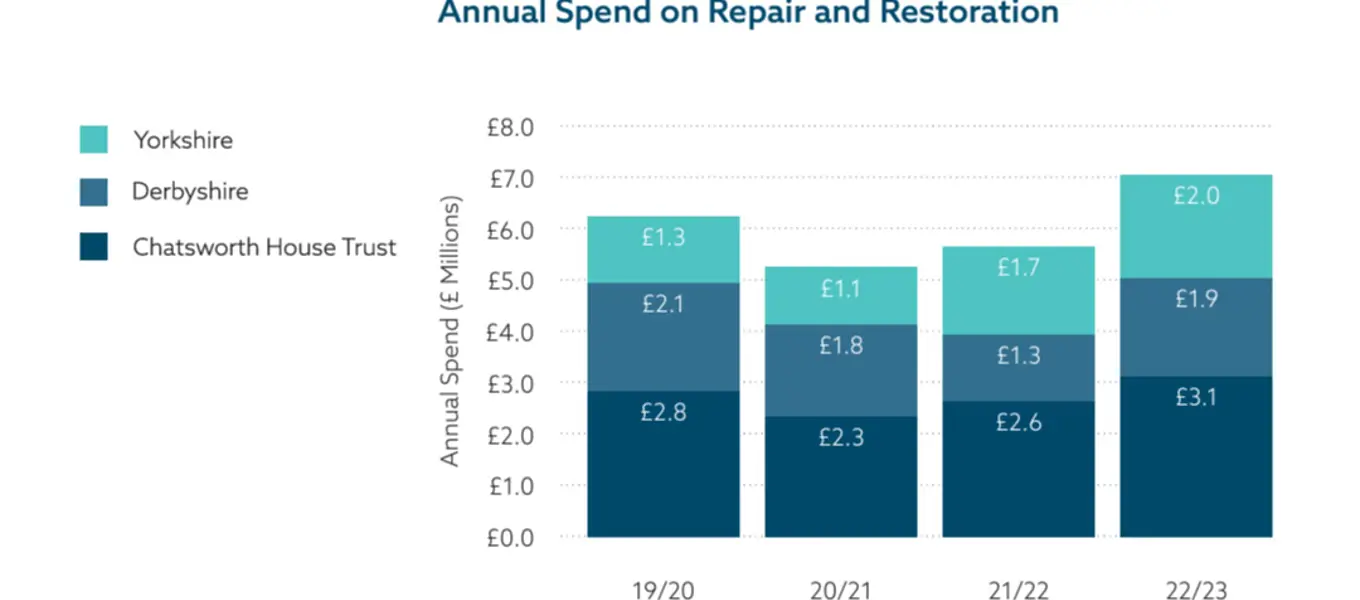 In 2022/23, a total of £7.0m was spent repairing and restoring Devonshire Group properties and landscapes: £2.0m was spent on the Yorkshire estate, £1.9m on the Derbyshire estate and the Chatsworth House Trust spent a further £3.1m.