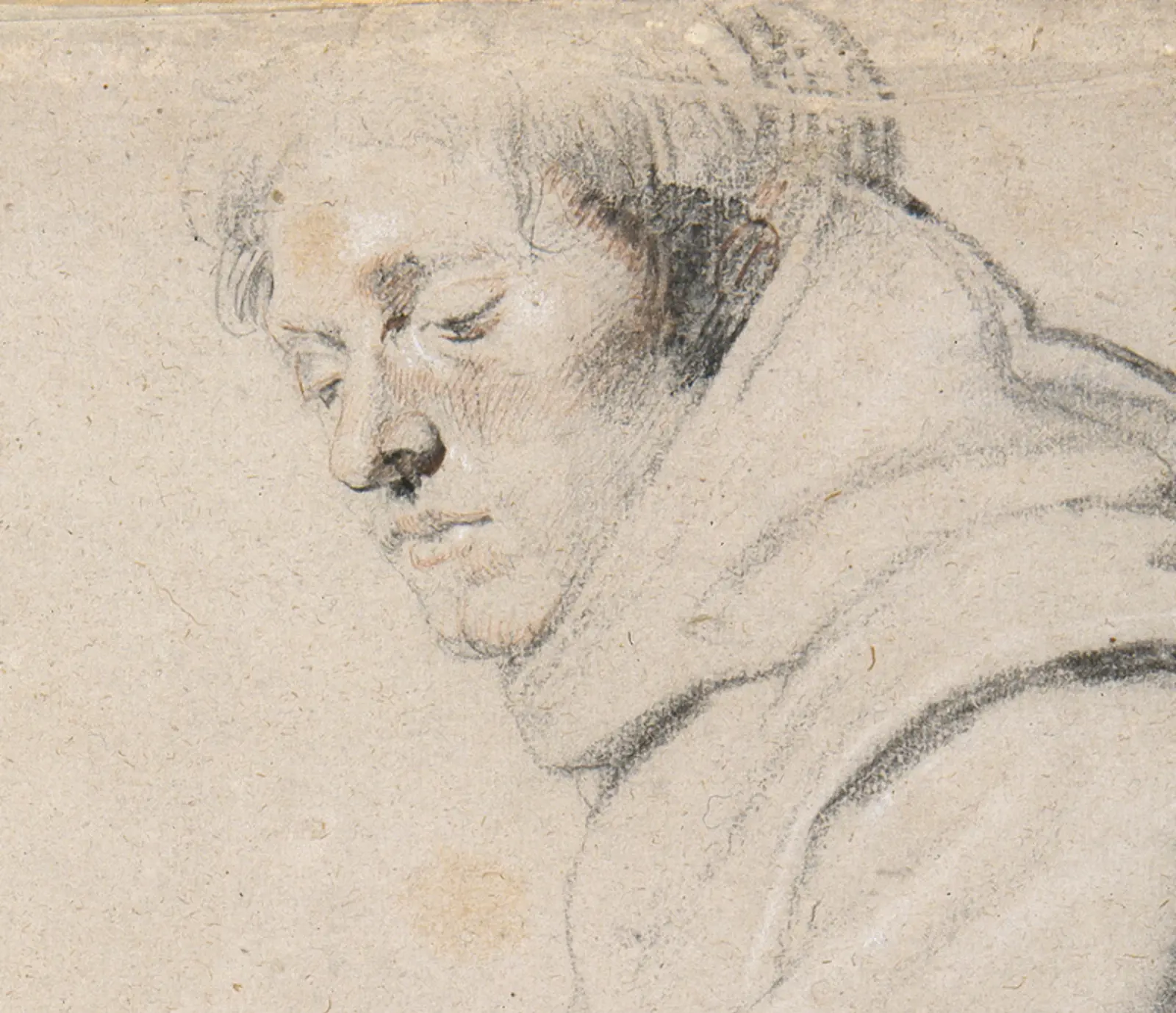 In this second detail, the ellipse of the hood frames the friar’s face. You can see that a swift sweep of the chalk suggests the ellipse. The black shading on the side and back of the hood also has a swiftness about it. Rubens concentrates his use of red chalk to the cheek, nose and chin of this friar. If you take a closer look, it’s also possible to see that some red chalk is visible in the friar’s hair. This might in fact suggest the earthy-brown colour of the Franciscan habit.