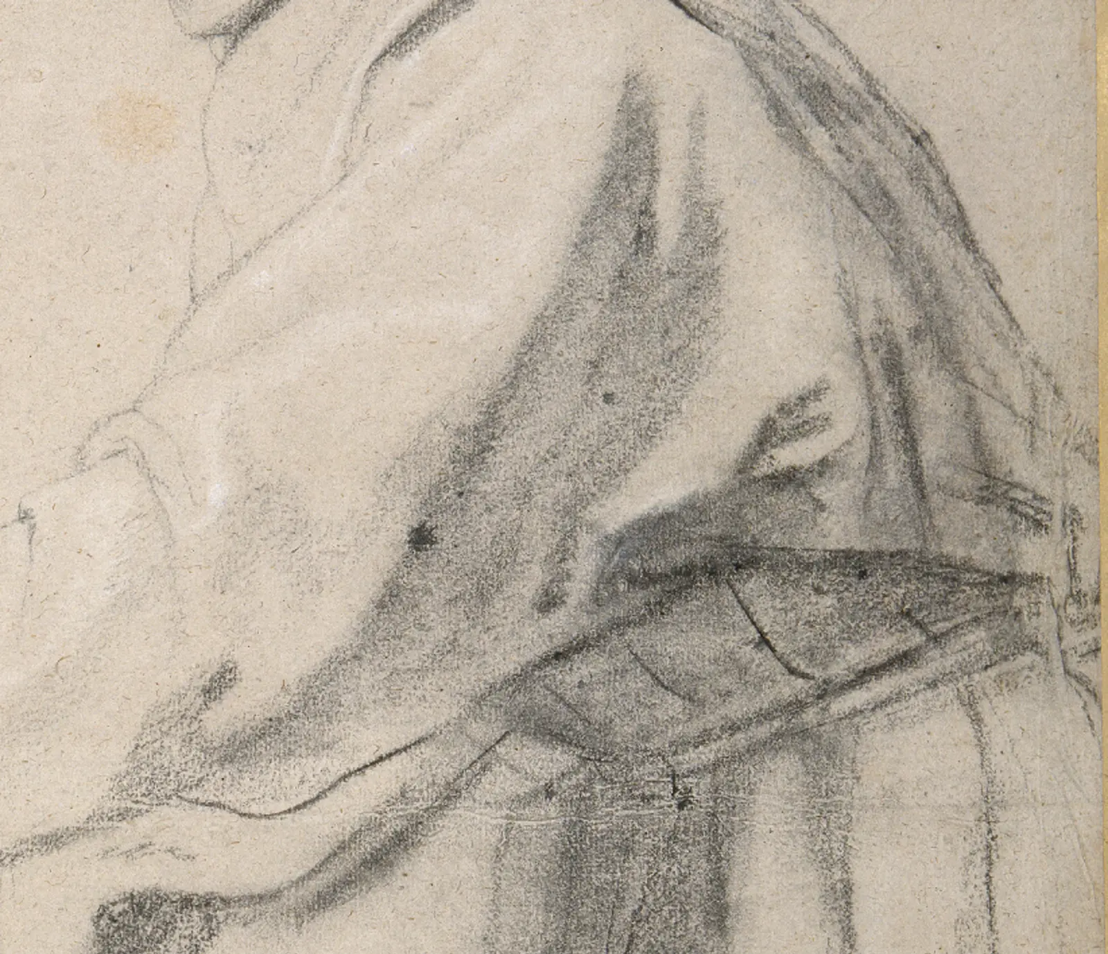It is tempting to imagine where he may have rubbed the chalk with his fingers to smudge and blend the creases and folds of the full sleeves and where the habit tapers towards the friar’s rope belt.