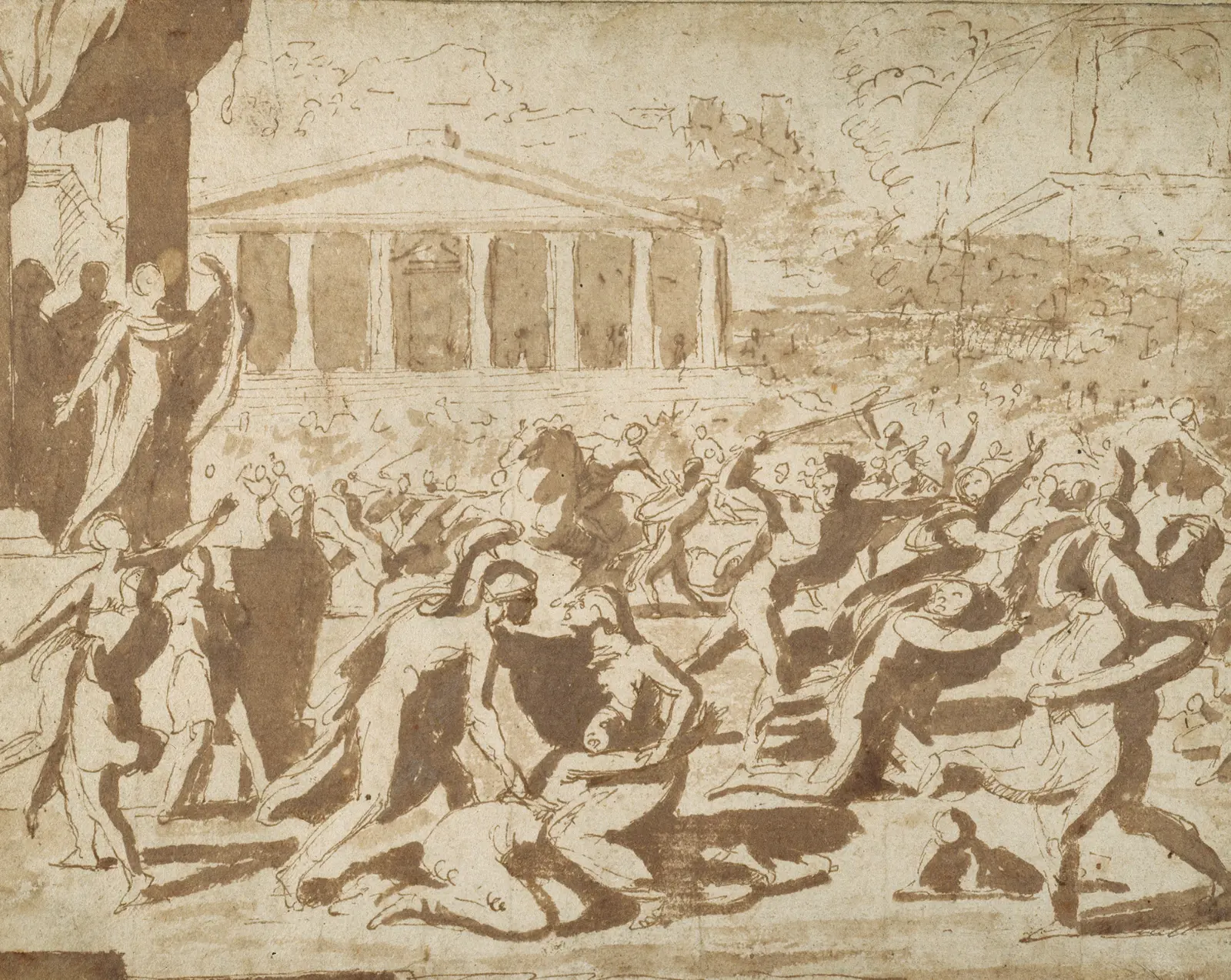 Image left: Nicolas Poussin, The Rape of the Sabines, pen and brown ink with brown wash on paper