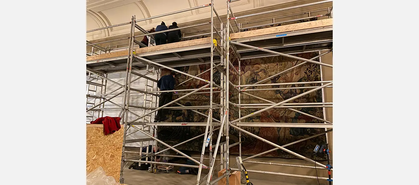 It was all hands on deck for the formidable task of unpacking and exhibiting these nearly 600-year-old tapestries safely – but how does one move and hang 50kg of fragile, intricately woven wool (twice over, no less)?