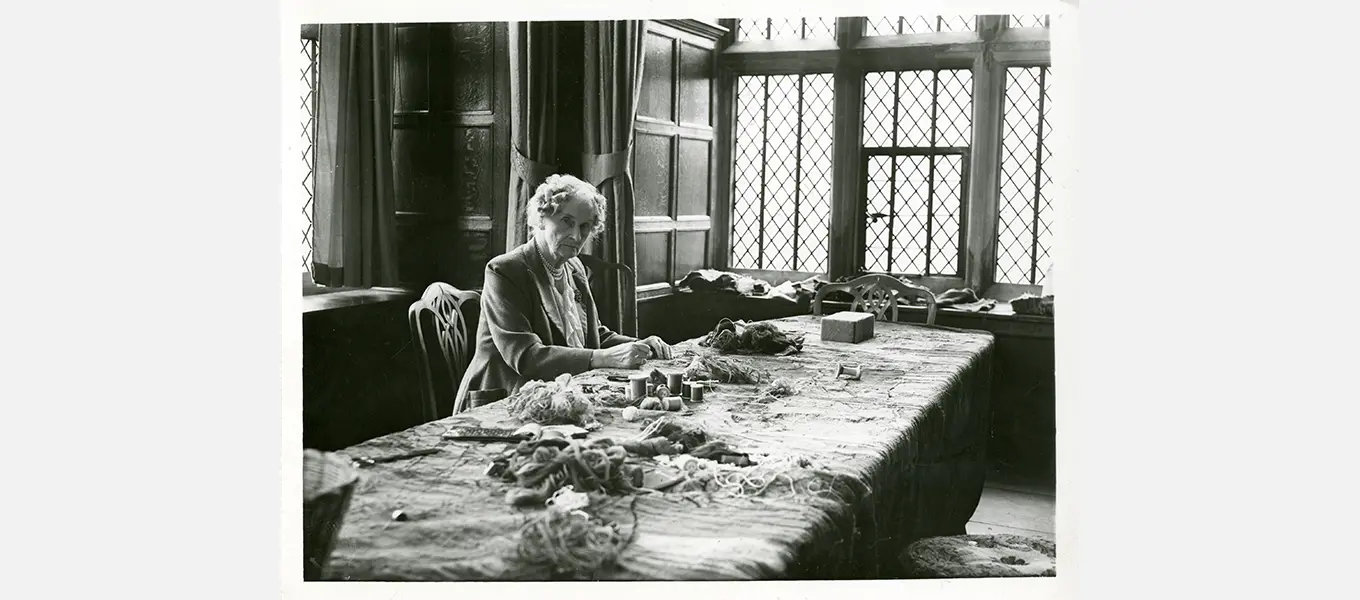 Evelyn Cavendish, Duchess of Devonshire, engaged in needlework at Hardwick Hall (c.1950s). Credit: Devonshire Collection Archives.