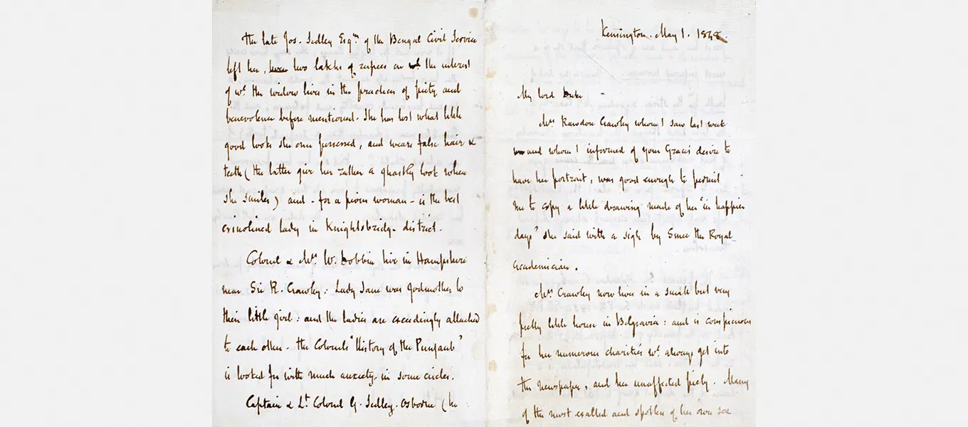Thackeray’s letter is written in a delightfully gossipy tone. In it he updates the Duke on developments in Becky’s story and outlines her current situation in life – essentially giving his correspondent a sneak preview of how the novel did actually conclude; the account differs only in minor respects from what followed in the final two instalments as published.