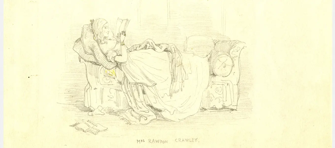 The Duke was clearly following the progress of Vanity Fair in Punch magazine, and before the novel had finished its serialisation he wrote to Thackeray asking for a portrait of the novel’s protagonist, Becky Sharp (or Mrs Rawdon Crawley). Thackeray was a skilled artist and illustrated many of his own books. He was only too happy to oblige the Duke, and duly sent a pencil sketch of Becky, reproduced below. In his accompanying letter, dated 1 May 1848, he pretends that it is taken from a sketch by the artist Sir Martin Archer Smee, showing Becky ‘in happier times’.