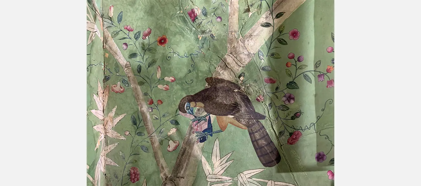 The way this style of wallpaper is constructed was been partly the cause of its damage. To make the wallpaper richer and disguise joins in the paper, it was common to add extra elements such as the abundance of birds and flowers found in the Queen of Scots Dressing Room. As the additional pieces have been added over time, the adhesive glues have dried and aged in different ways, leading to visible seams and the paper contracting.