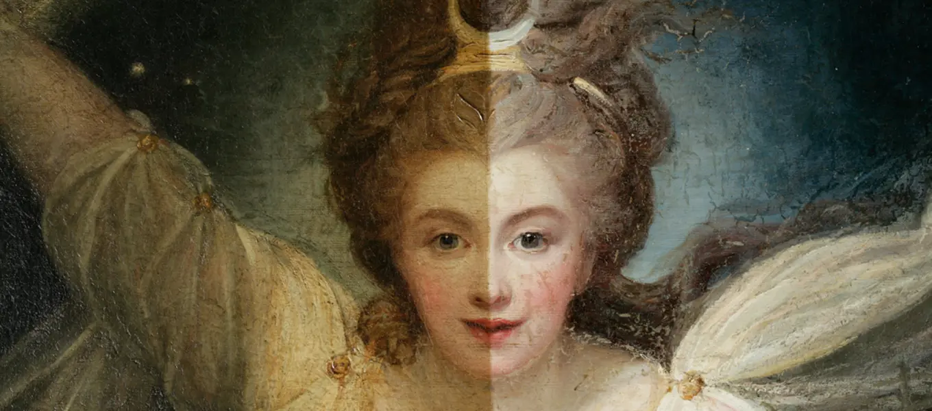 It draws on imagery from Edmund Spenser’s epic poem 'The Faerie Queene', written in the 1590s, where Cynthia, Goddess of the Moon, breaks through dark clouds to illuminate the world and deliver 'a thousand blessings'. This is Georgiana depicted as a powerful goddess, it is also the painting that her son, the 6th Duke of Devonshire, said was '...very like my Mother, and it is almost the only likeness of her that reminds me of her countenance.' (A Handbook to Chatsworth and Hardwick, by 6th Duke of Devonshire).