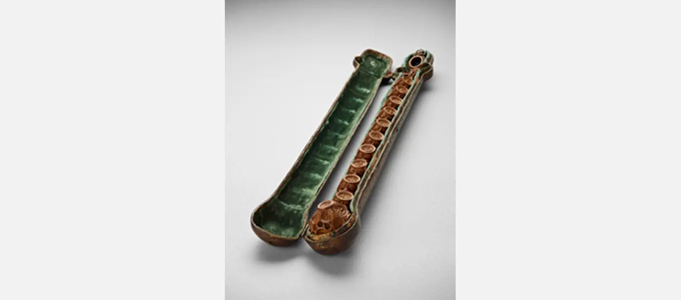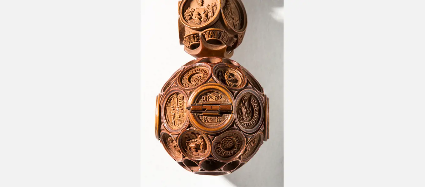 The rosary is carved from boxwood which has a compact structure ideal for carving, the wood is firm and takes detailed carving but is not so hard it is too difficult to sculpt. Boxwood is also ideal for an object made to be handled as the wood becomes smoother and polished. It’s likely the rosary was made in a workshop in the Netherlands, one maker of these objects was called Adam Dircksz.
