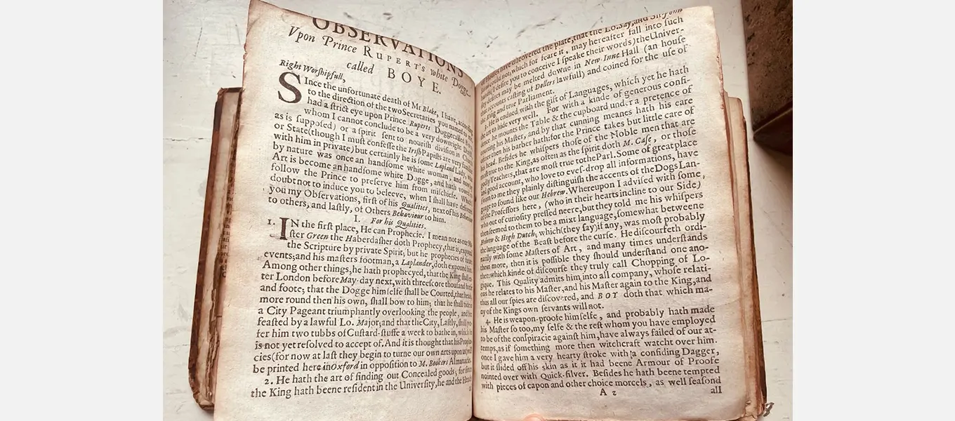 This Parliamentarian superstition towards Boy, and their obsessive demonising of the little white poodle, caught the attention of Royalist satirists, who mocked and ridiculed such attitudes in their own parodies and pamphlets. One satirist’s publication claimed that Boy was a shapeshifting ‘white woman’, some ‘Lapland Lady’, ‘who by nature was once a handsome white woman, who by some art is become an handsome white Dogge’. It is here in the Chatsworth archives that we have come across such a story. Bound in a leather volume, amongst 52 other pamphlets, is a copy of the ‘Observations upon Prince Rupert’s White Dog Called Boy’, a satirist piece published in 1643.