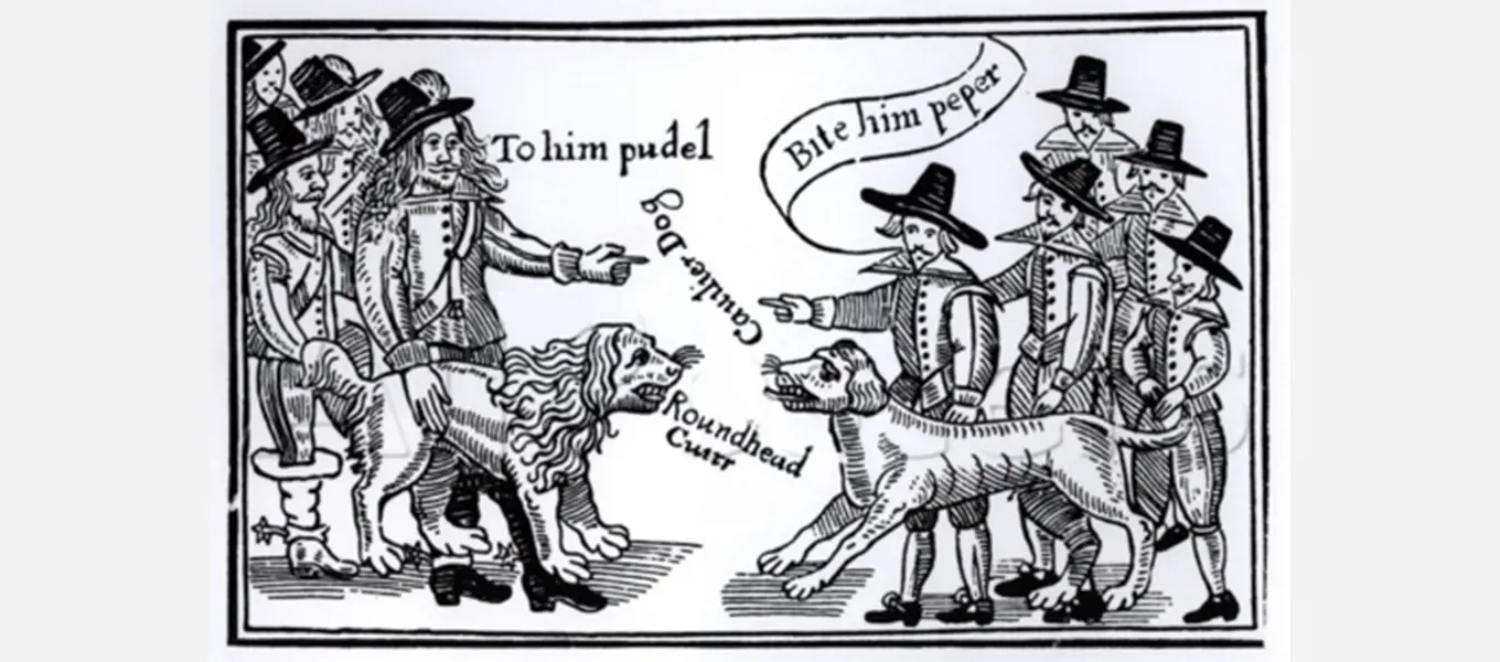 Another famous ‘Cavaliers v Roundheads pamphlet’ was humorously styled: ‘A Dialogue, or, Rather a Parley Betweene Prince Ruperts dogge Whose Name is Puddle (Boy), and Tobies dog Whose Name is Pepper, &c.’’ which shows a cartoon of the two dogs exchanging insults (seen in the image below).