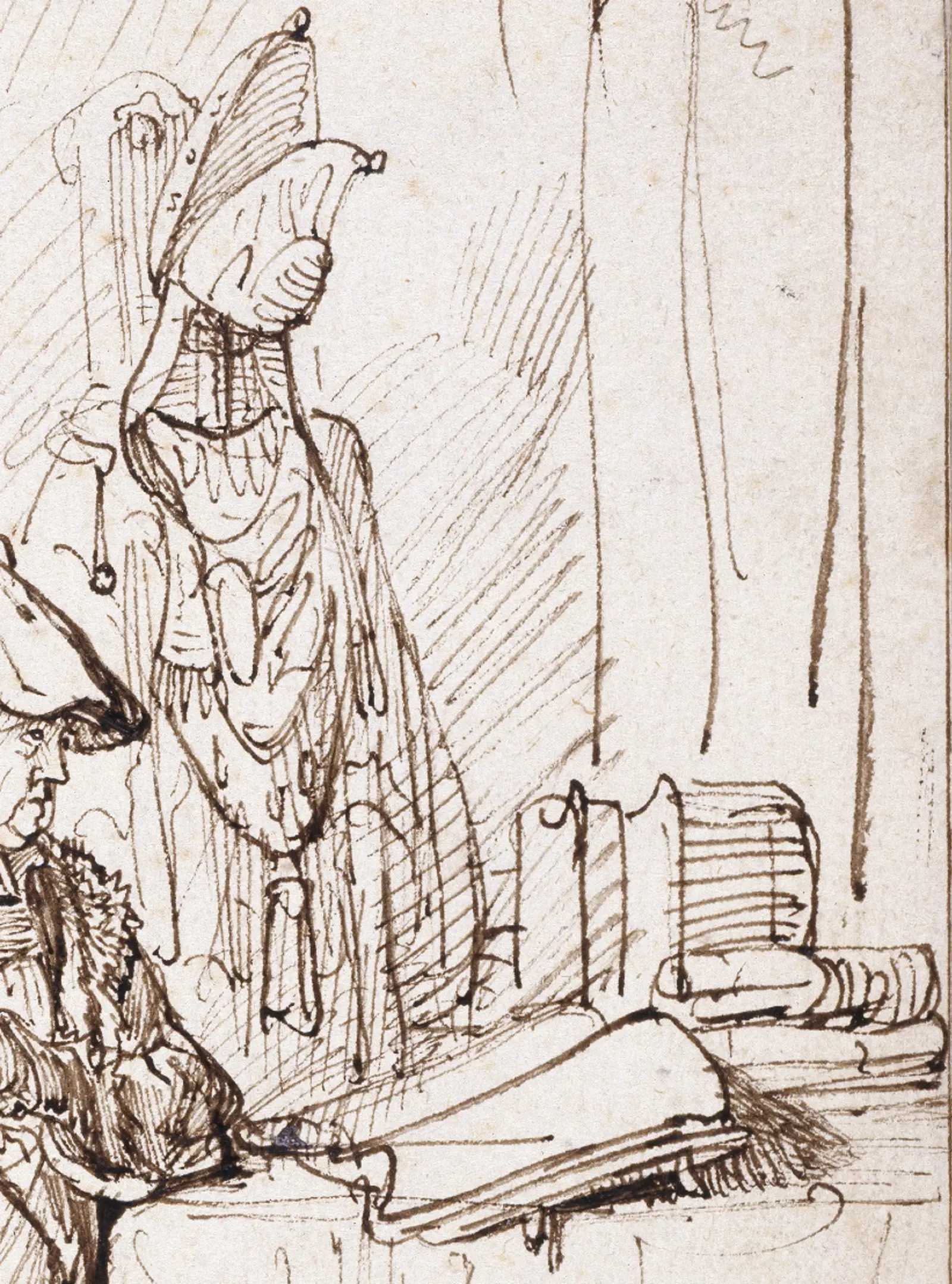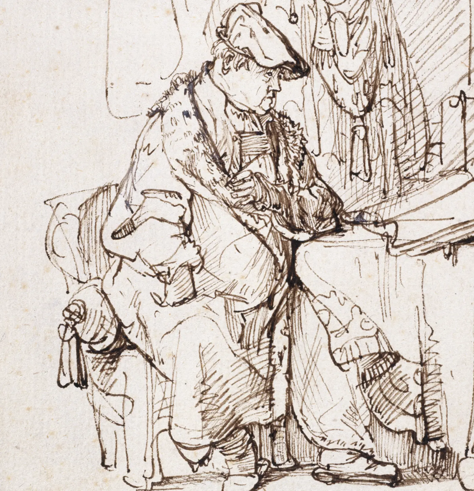 Rembrandt’s handling of pen and ink are electrifying. The assured parallel hatching of the actor’s right hand and across the fabric covering his right shin almost resemble the vital life signs of a cardiogram. The possibility of movement at any moment is rife. With the physical energy of flicking his wrist, Rembrandt has animated this flat surface.