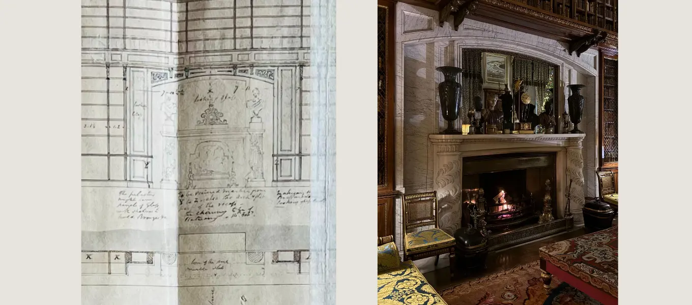 In removing the original fireplace, Wyatville, designed a new marble design, shown above (left: his sketch, right: the current fireplace in use in the Library).