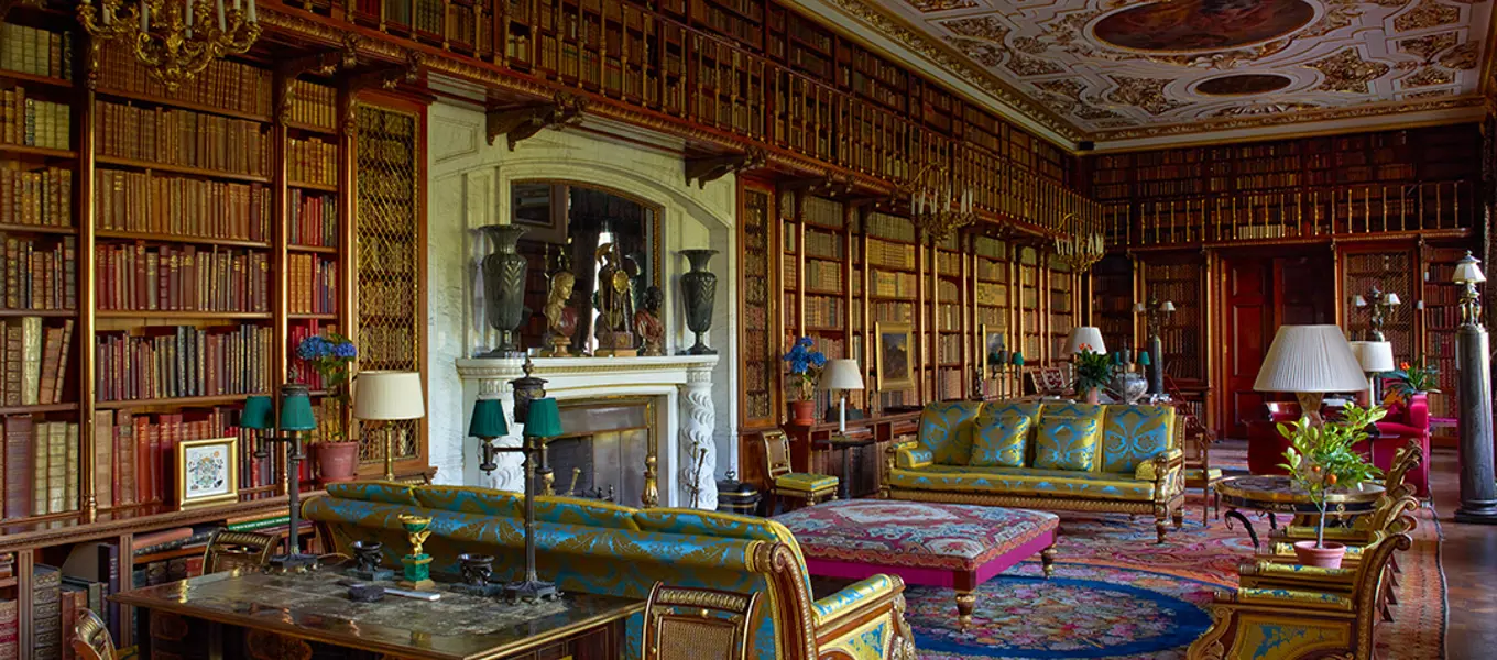 The furniture in the Library comes from many different family houses. The four book tables, two at each end of the room, were designed by William Kent for the Library at Chiswick. The large suite of seat furniture attributed to Morel and Hughes was brought from the Saloon at Devonshire House. In 2013 it was restored and reupholstered with a reweave of the original turquoise and gold silk brocade.
